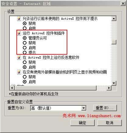 4、再次拖动左边的滑块直到看见“运行 ActiveX 控件和插件”,然后选择“启用、提示、管理员认可”都可以(图3),最后点击“确定”即可。