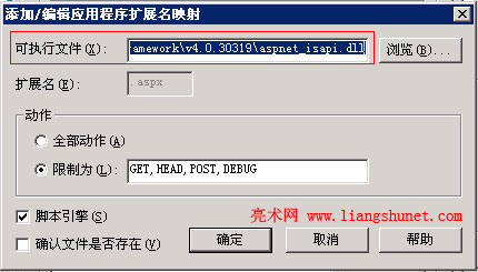 打开 iis6 → 展开“网站” → 右键通过 route 重写Url的实现伪静态的网站 → “属性” → “主目录”选项卡 → 配置 → 找到 .aspx → 编辑 → 复制“可执行文件”后面的路径 → “取消”返回“应用程序配置”窗口 → 添加 → 把刚才复制的路径粘贴到“可执行文件”后面 → “扩展名”填 htm → 把“确认文件是否存在”前面的勾去掉 → “确认”即可。