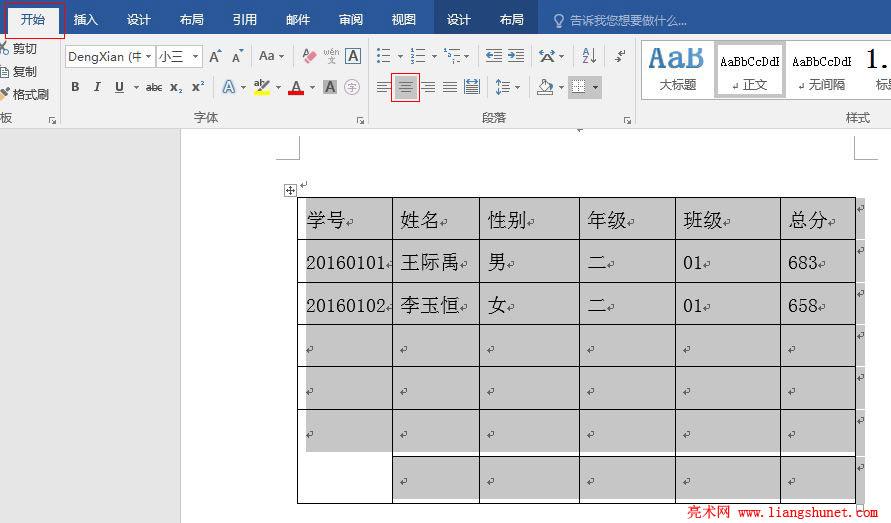 2、选择“开始”选项卡,现在表格是左对齐,如果把它设置为居中,单击“段落”区块“居中”图标,此图标成选中状态,表格居中对齐,如图2所示: