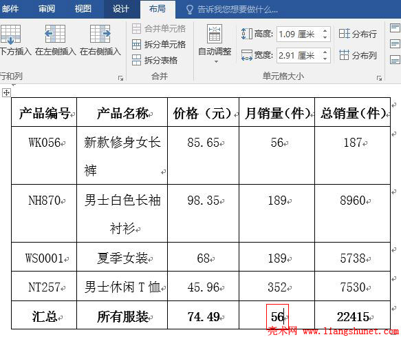 1、仍以服装产品表为例,假如要对总销量求和。把光标定位到“汇总”行最后一列,如图1所示:
