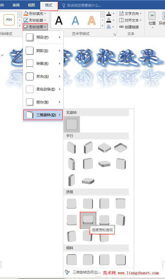 1、选中“艺术字形状效果”,单击“形状效果”,选择“三维旋转” → 透视下的“适度宽松透视”,如图10所示: