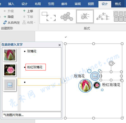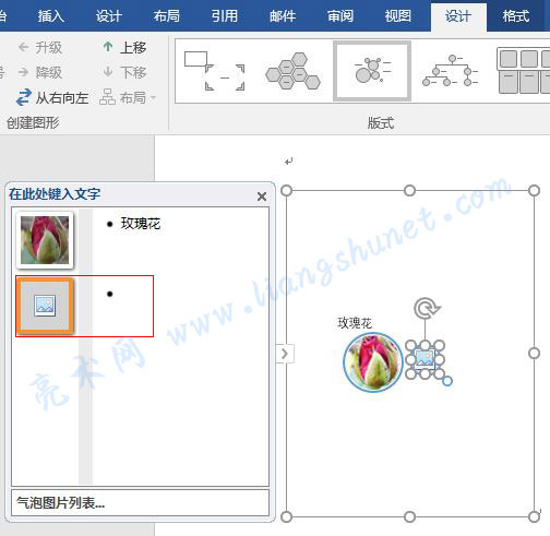 5、按回车,气泡图片列表框中出一个等待插入图片的图标,图标左边等待输入图片;包含玫瑰花的大圆圈右上角的小圆圈也出现一个等待插入图片的图标,同时小圆圈往下移了,如图5所示: