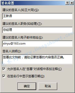 3、填好签名人姓名、职务、电子邮件地址和说明,并勾“允许签名人在“签署”对话框中添加注释”,如图3所示: