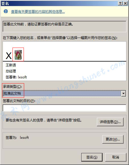 6、单击“选择图像”,插入一张作为签名的图片,我们任意选择一张图片;“承诺类型”选择“批准此文档”,如图6所示: