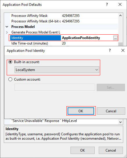2. If adding the "Modify" permission to the MachineKeys folder does not work, you can change the "predefined user" to "local system" in the IIS application pool(note: to reduce security), the steps are as follows: