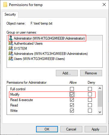 8. Select the newly added user(such as Administrator), check "Modify" to assign modification Permission to it, and modify the Notepad file after clicking "Ok".